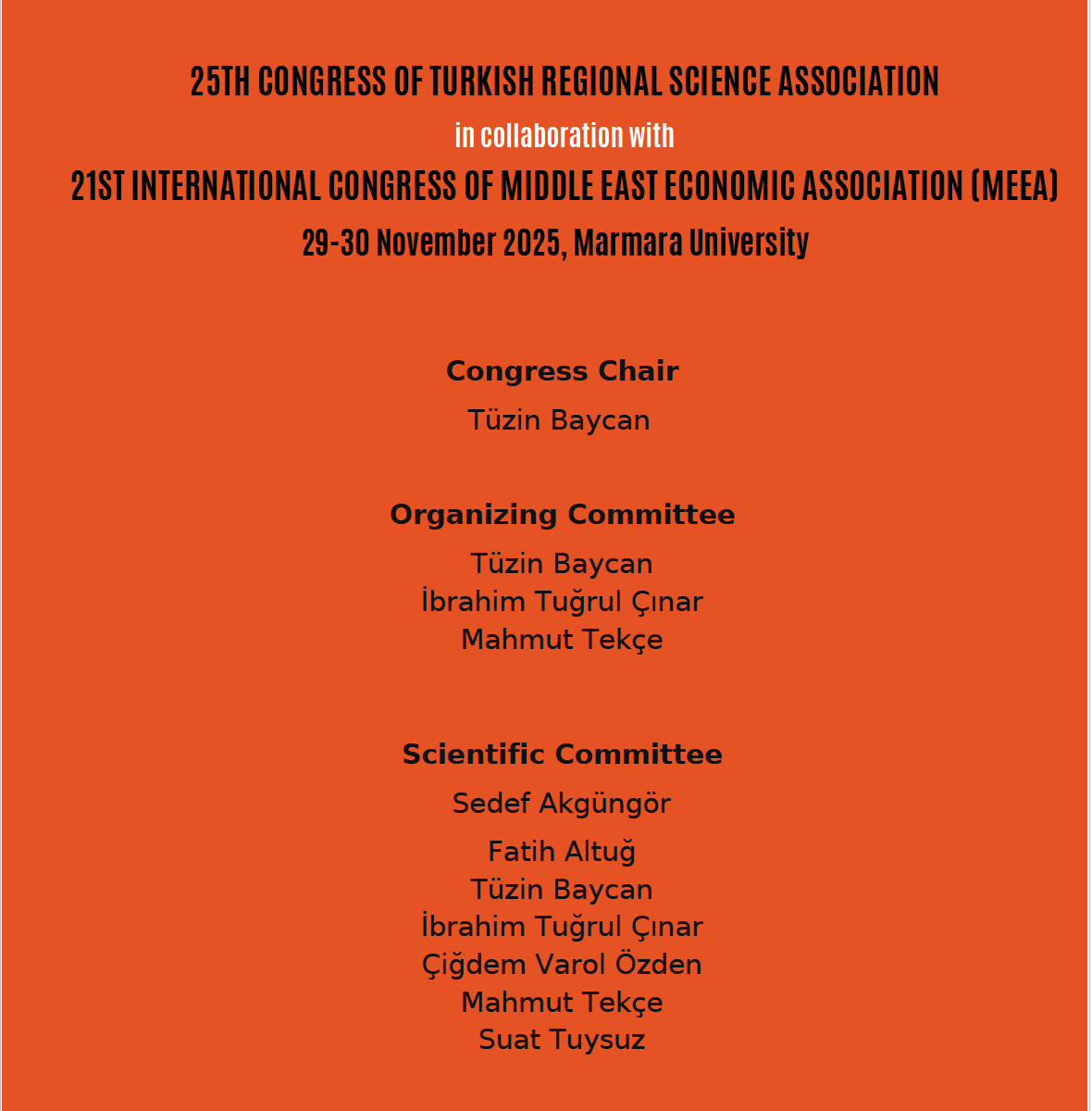 Bildiğiniz üzere Turkish Regional Science Association (BBTMK) olarak 25. Kongremizi Middle East Economic Association’ın (MEEA) 21. Uluslararası Kongresi ile birlikte bir Joint Conference olarak 29-30 Kasım 2025 tarihleri arasında Marmara Üniversitesi ev sahipliğinde düzenliyoruz. Bu kongre için iki ayrı kongre programı hazırladık. Programlardan birini Joint Conference Program olarak hazırladık, ikinci programı ise BBTMK 25. Kongre Programı olarak düzenledik, bu ikinci program Joint Program’da “Regional Science:… “ başlıklı BBTMK oturumlarından oluşan bir program. BBTMK üyelerimizin bazıları aynı zamanda MEEA’nın da üyesi oldukları için BBTMK Oturumları dışında farklı oturumlarda da yer alıyorlar. Dolayısıyla her iki programın da birlikte kullanılmasında yarar var.