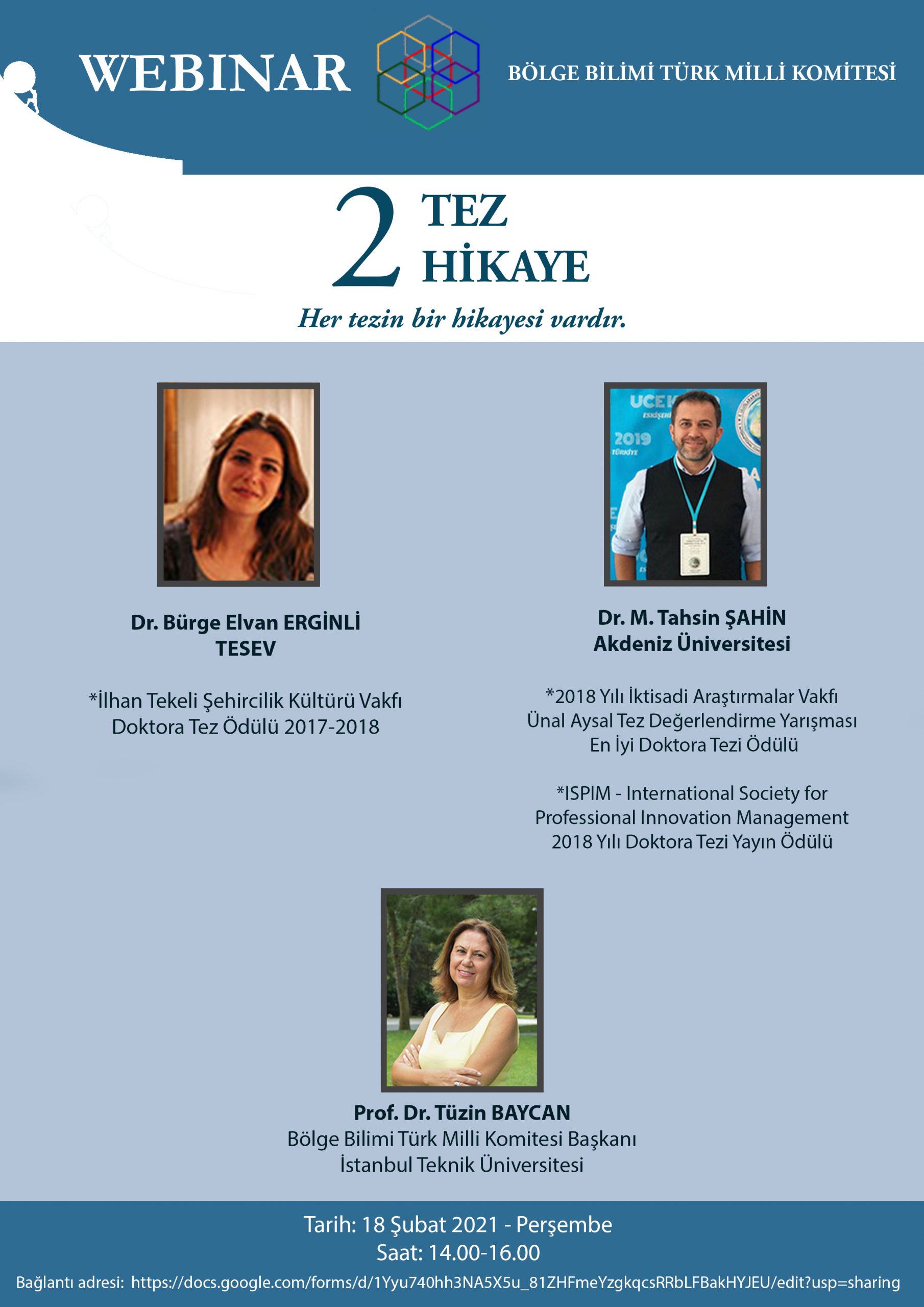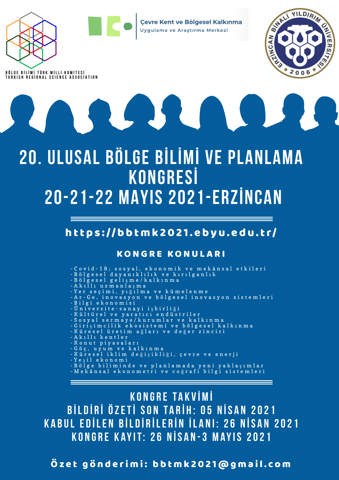 20-21 Mayıs 2021 tarihleri arasında Erzincan Binali Yıldırım Üniversitesi ev sahipliğinde ‘online kongre’ olarak gerçekleşen 20. Ulusal Bölge Bilimi ve Bölge Planlama Kongresi’nin tüm oturumlarına Youtube kanalımızdan erişebilirisiniz. Bölge Bilimi Türk Milli Komitesi’nin resmi Youtube kanalına ulaşmak için tıklayınız. Online olarak etkinliklerimizi takip etmek ve en son etkinliklerden haberdar olmak için abone olmayı unutmayınız.